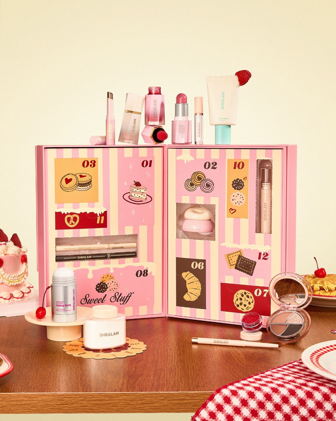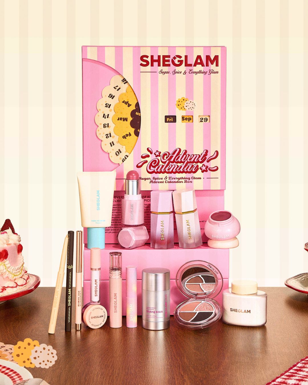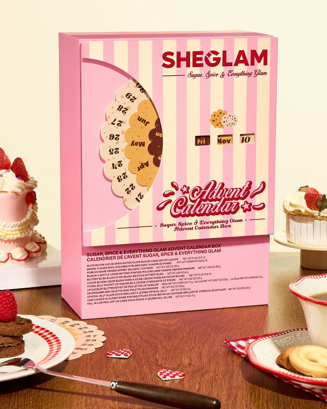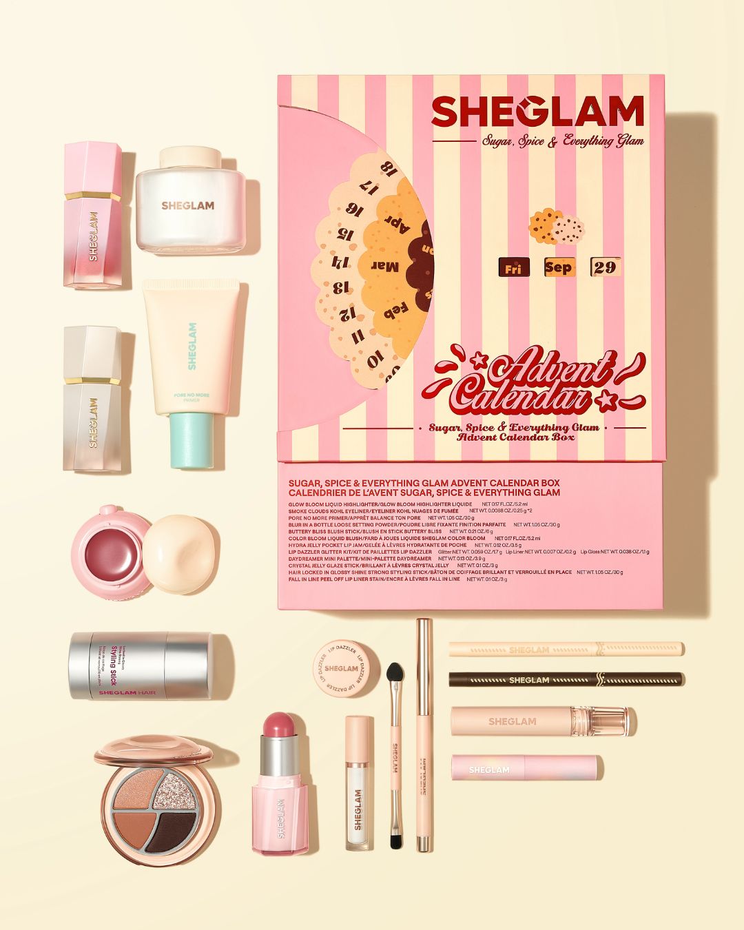 جعبه ست تقویم آرایشی شیگلم معمولا با عنوانهایی مثل شکر، ادویه و همه چیز درخشان یا نسخههای مشابه عرضه میشود و ترکیبی از محصولات پرفروش را در خود جای داده است. بر اساس بررسیهای اخیر نسخههای ۲۰۲۵ و ۲۰۲۶، داخل آن مواردی مانند پایه آرایش محوکننده منافذ، پودر فیکس ماتکننده، پالت سایه چشم کوچک رویایی، خط چشم کرمی دودی، تینت لب جدا شونده، استیک حالتدهنده مو، رژگونه مایع، درخشنده، برق لب، مداد چشم و گاهی محصولات مراقبتی کوچک مثل ماسک لب یا بالم دیده میشود.
